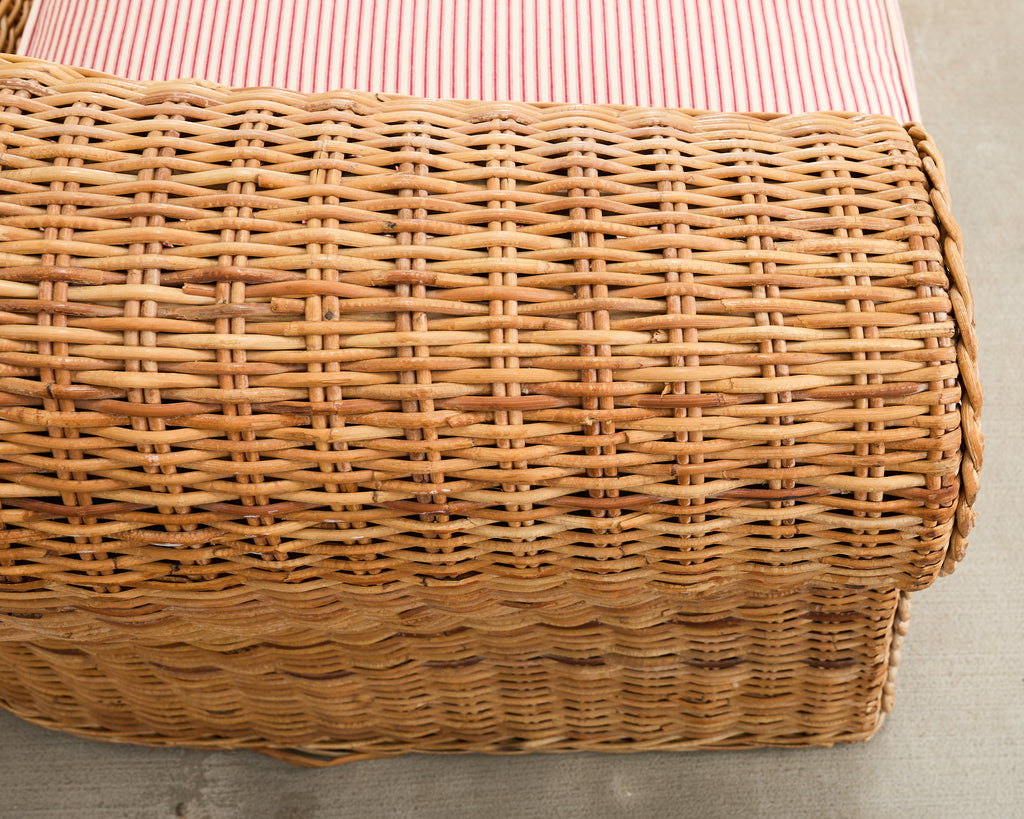 Condition: Good, wear consistent with age and use. Reupholstered. Minor fading. Beautifully crafted with solid joinery and construction. Age-appropriate wear and fading as seen in photos. Newly upholstered cushion. Minor chips, scuffs, cracks, and small wicker losses as expected that are difficult to see.
