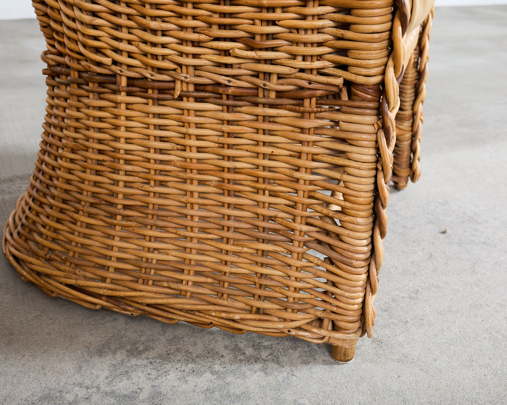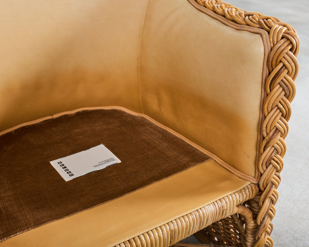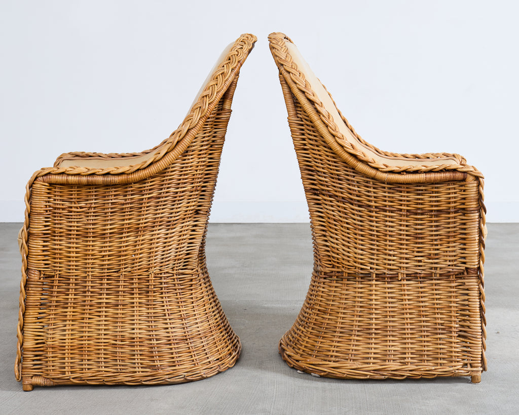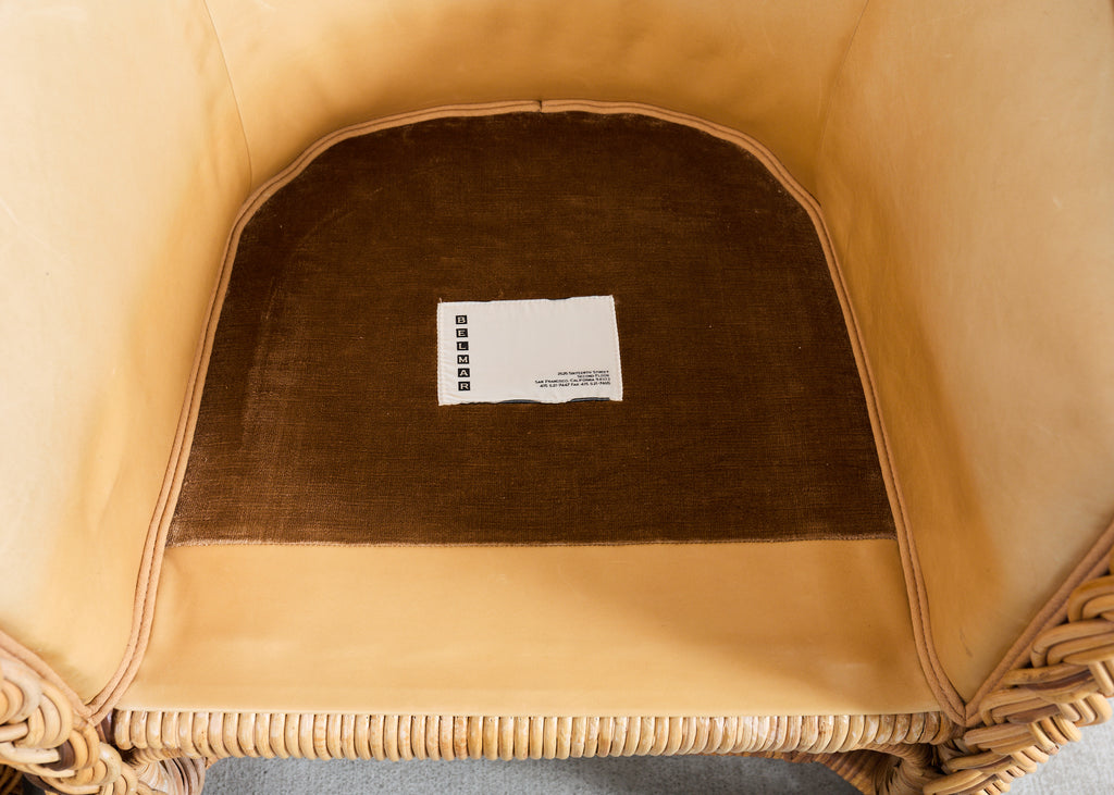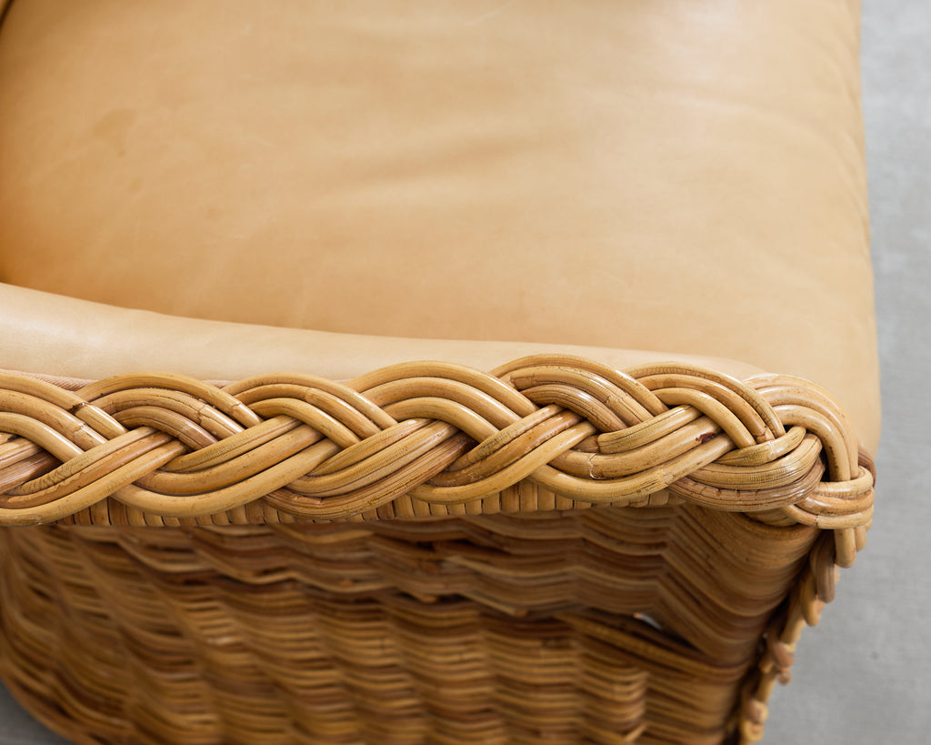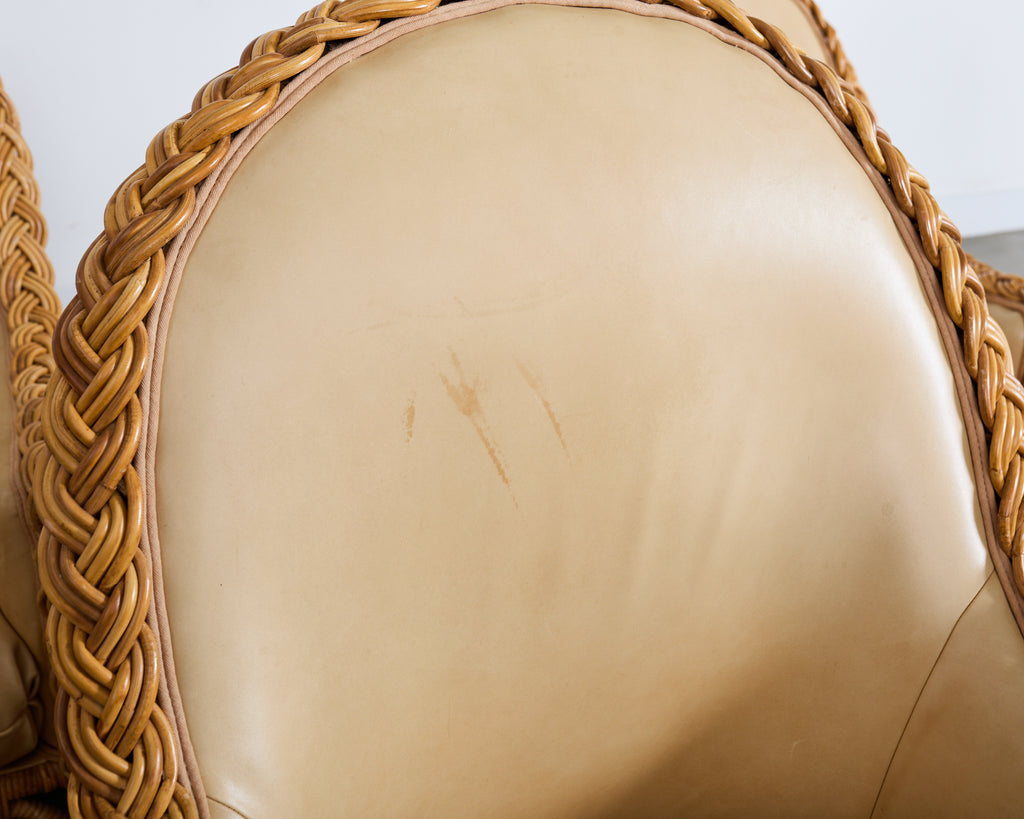 A substantial suite of eight gorgeous rattan and wicker armchairs from the estate of late California Senator Dianne Feinstein (1933-2023) San Fransisco, CA. The bespoke chairs appear to be from "The Wicker Works" crafted in Italy in the manner and style of Michael Taylor design circa 1980's. The chairs feature a dramatic enveloping, high-back silhouette and a thick hand-braided rattan border tracing the crest, arms, and seat. The frames are constructed in a light honey toned rattan accentuated by the later added upholstery in a butter soft leather by Belmar in San Fransisco, CA. Each chair is constructed with a pole rattan frame wrapped with a tightly woven wicker exterior and a flared skirted base giving the chairs a subtle hourglass profile. The interiors are fully upholstered in a warm parchment or sand toned leather, and include a thick fitted loose seat cushion. Below the seat, an open stretcher area with woven paneling provides visual lightness and openness. The chairs read equally well as California Coastal, Palm Beach, Organic Modern, or Tropical styles. The arms measure 25.5" high. The chairs are very comfortable and supportive. The frames are sturdy with solid joinery. The rattan and leather have an aged patina as seen in photos commensurate age and use. Sold as a set of eight chairs. Stylish chairs with an interesting provenance.