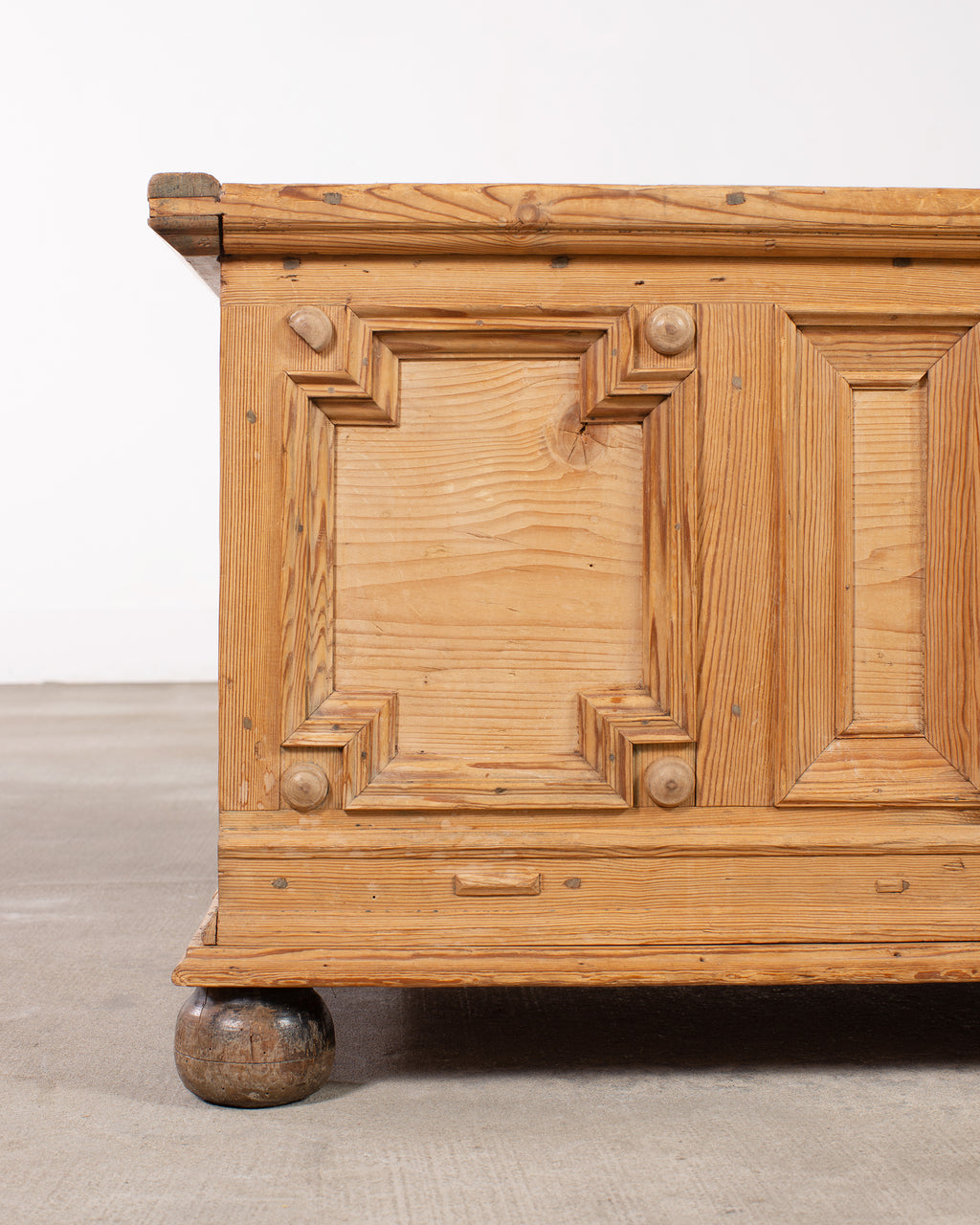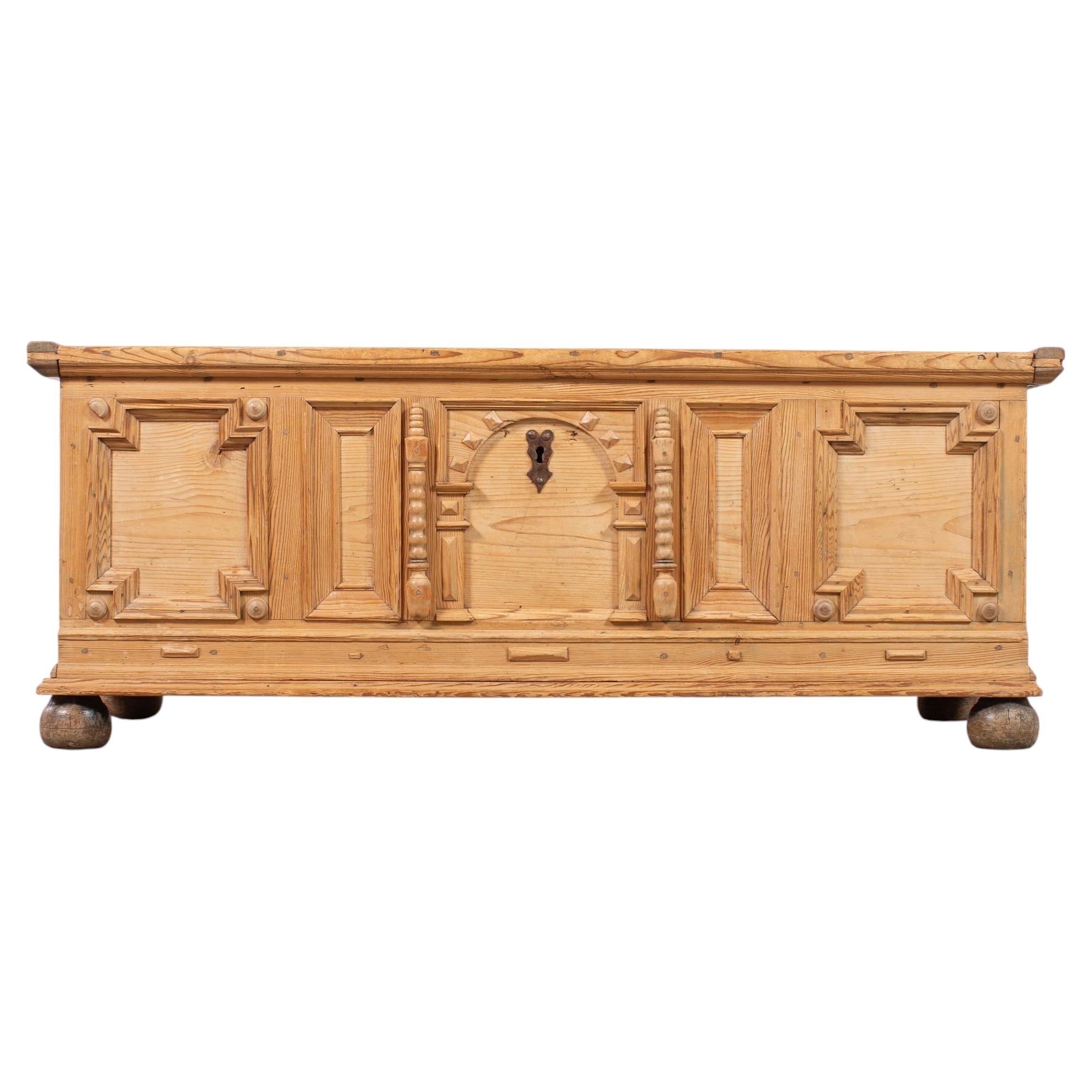 A handsome 18th century carved pine blanket chest in the Dutch baroque style with a paneled façade and storage space. Crafted in a rustic Baroque alpine Central European style, likely from Germany, Austria, Netherlands or Switzerland in the 1730s. The front features intricately carved, stepped ornamental panels and a central arched portal panel framed by turned spindle pilasters with a iron keyhole escutcheon. The chest retains iron strap hinges and opens to a generous storage interior with a side lidded till box. The chest is supported by heavy turned bun feet and finished in a warm natural honey pine tone. The pine has a weathered, distressed aged natural patina with old repairs as expected. Functional as a blanket chest, coffee table, coffer, trunk, or end-of-bed storage. From an estate in the Napa Valley, CA.