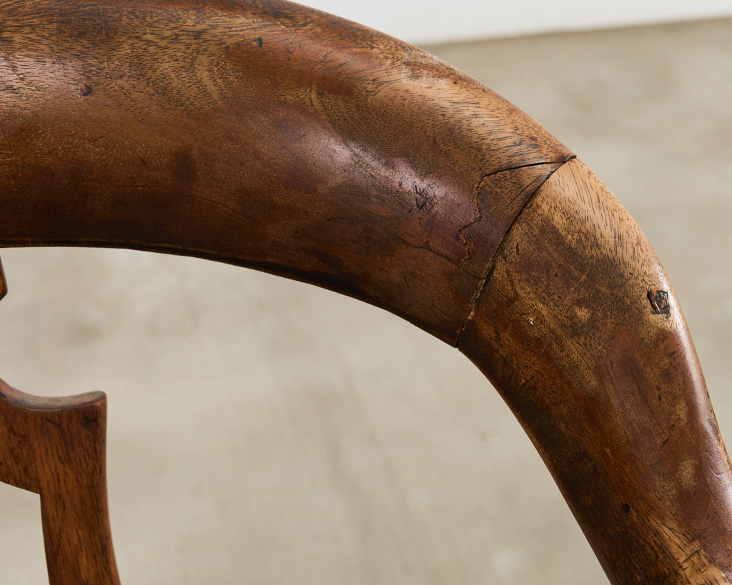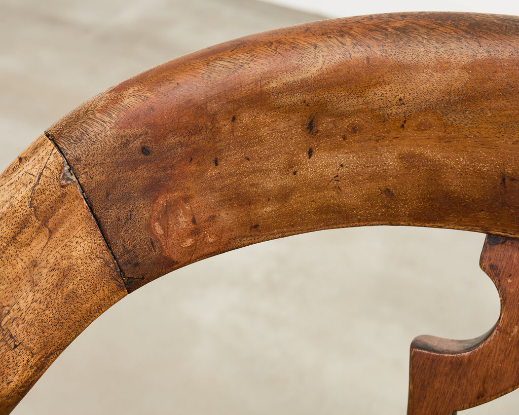 Handsome 19th century English Victorian period captains chair or smokers' bow chair crafted from mahogany. The chair features a round horseshoe shaped seat crest with a deep contoured saddle seat. The generous seat has a swivel mechanism and a central pierced splat. The seat is supported by undulating cabriole-style legs ending with later added casters. The hardwood has a desirable aged patina on the finish commensurate age and use. The ergonomic design is very comfortable with 29 inch high arms. From an estate in San Francisco, California.