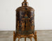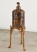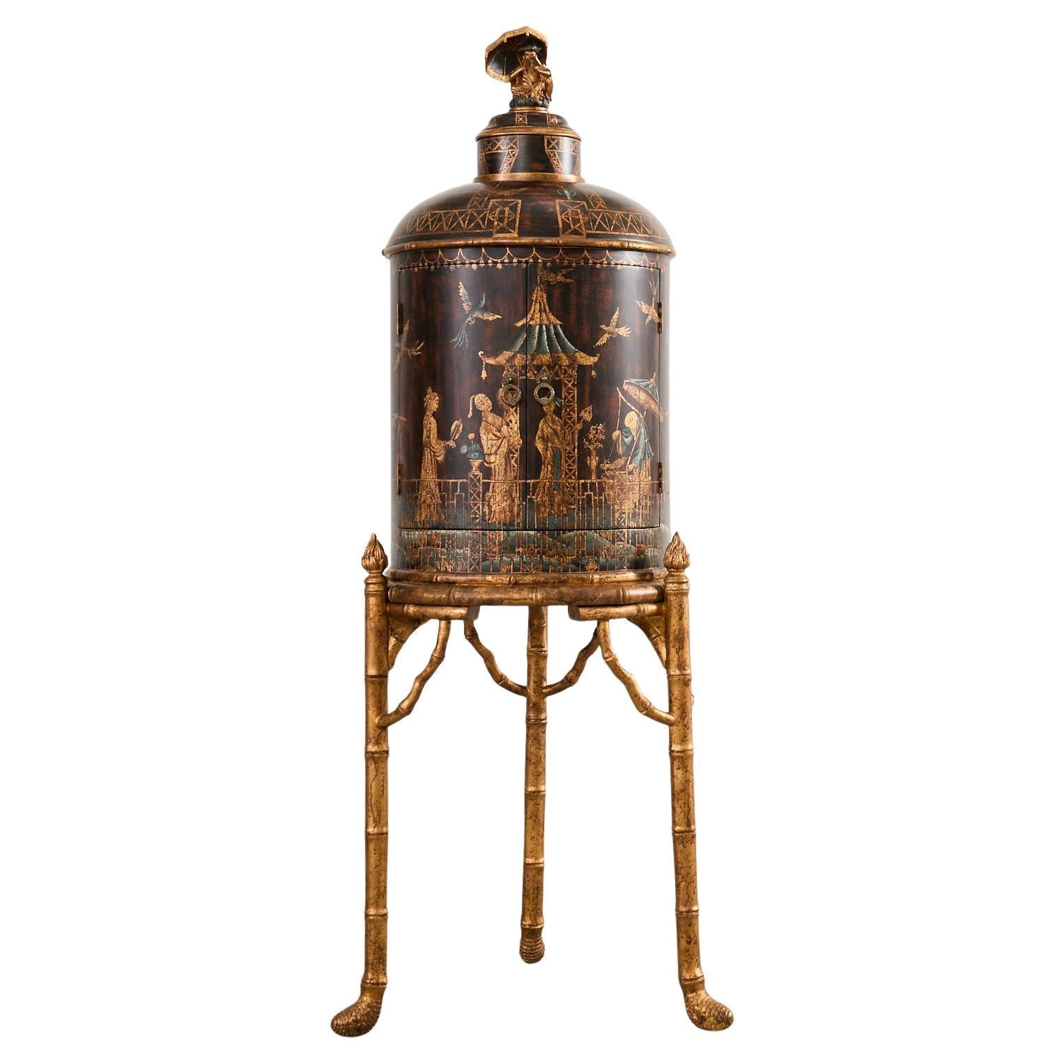 Fantastic contemporary faux-bamboo dry bar cabinet mounted to a gilt stand embellished with chinoiserie Asian motifs. The cylindrical top is crafted from wood veneers and features a domed top surmounted by an Asian figure reading a book under an umbrella. The top is fronted by two doors that open to a shelved storage area with patinated brass pulls. The cabinet is mounted to a faux bamboo stand with detailed round legs that end with splayed feet. The legs have decorative faux bamboo spandrels and are topped with gilt torch finials. The whimsical cabinet has idyllic painted scenes with parcel gilt highlights and shades of teal blue. Heavy and solid with excellent joinery and craftsmanship. From an estate in San Francisco, CA.