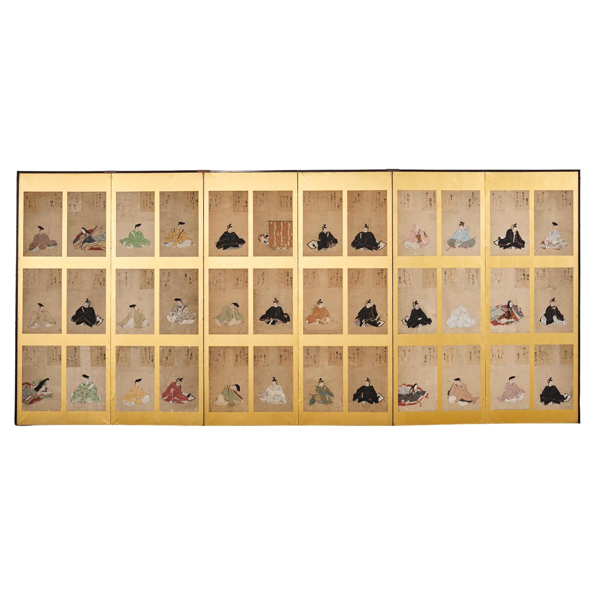 Interesting 19th century Japanese Edo period six-panel byobu screen depicting the thirty six immortals of poetry (Sanjurokkasen). Each portrait is accompanied by their poems. The poets are from the Asuka, Nara, and Heian periods. Painted in the Kano school style though executed in the Tosa school manner. The portraits are set in a wood frame with a dramatic gilt background. The paintings have a desirable aged patina with fading, but their beautiful robes still having vivid color. From an estate in Beverly Hills, CA. The entire full list of all 36 immortal poets can be found in the photos.