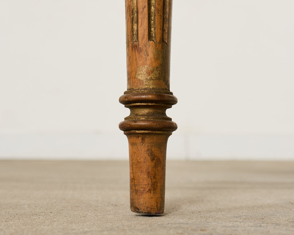 Condition: Distressed, wear consistent with age and use. Beautifully crafted and carved with an intentionally distressed, stripped finish as seen in photos. Age appropriate wear with minor chips, scuffs, scratches, paint remnants, faded upholstery. Fair joinery.
