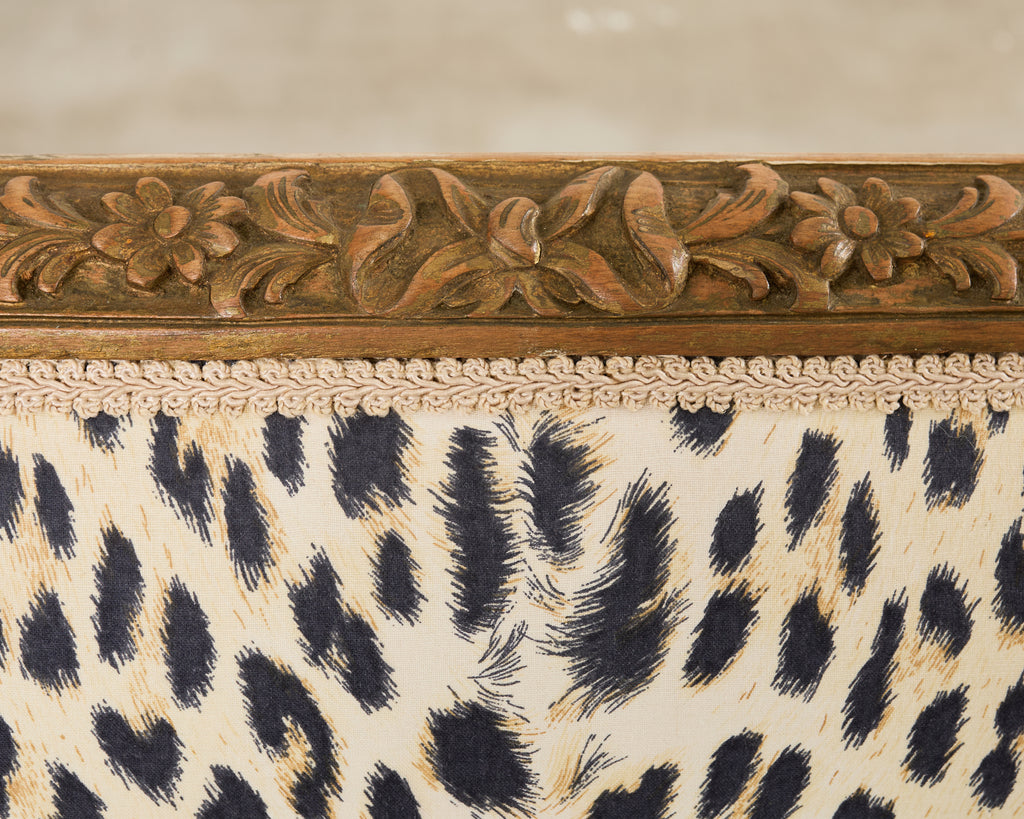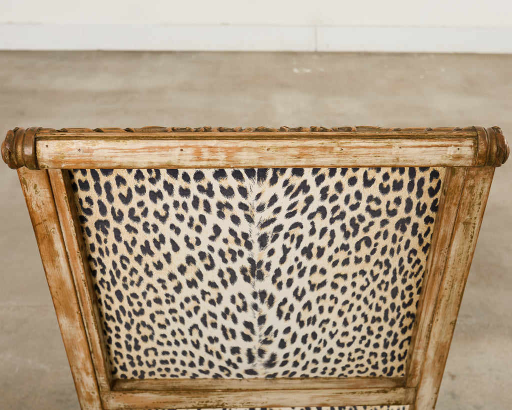 Dramatic pair of highly carved beechwood armchairs crafted in the grand French Louis XVI taste. The chairs feature a large square back with a scrolled crest decorated with floral detail. The generous seat is bowed in the front with large padded, scrolled arms measuring 25.5 inches high. The frames are upholstered with a whimsical cheetah print fabric with a nicely aged patina. The seat is supported by tapered, fluted legs ending with peg feet. The chairs have a handsome profile with a beautifully aged finish. The fabric is faded but shows well and compliments the weathered finish on the frames. From an estate in Beverly Hills, California. Price is for the pair.
