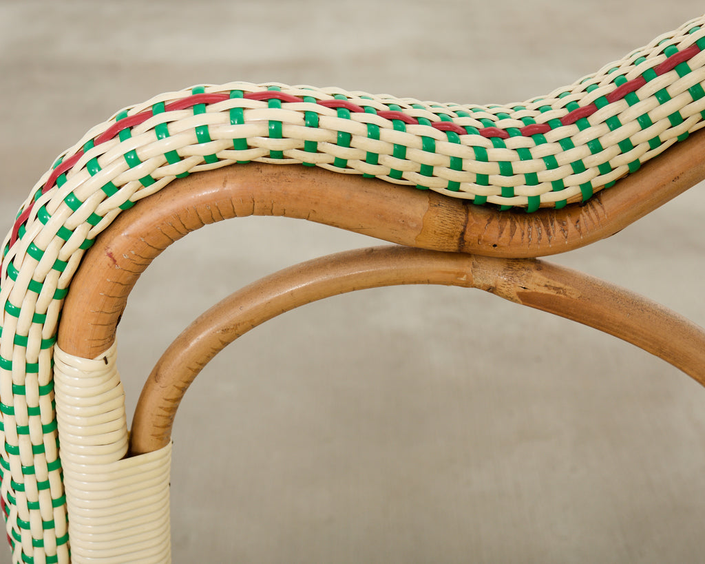 Whimsical pair of bistro cafe rattan dining armchairs made in the art deco taste by Maison Gatti Paris, France. The chairs feature gracefully curved or bent rattan frames. The arms and seat are embellished with colorful woven resin wicker. The design is true to the original late 19th century Parisian decorative arts style. The chairs are sturdy and solid with excellent joinery and craftsmanship. The rattan has an aged patina on the finish and vibrant colored braided wicker. Sold as a pair. From an estate in San Francisco, CA.