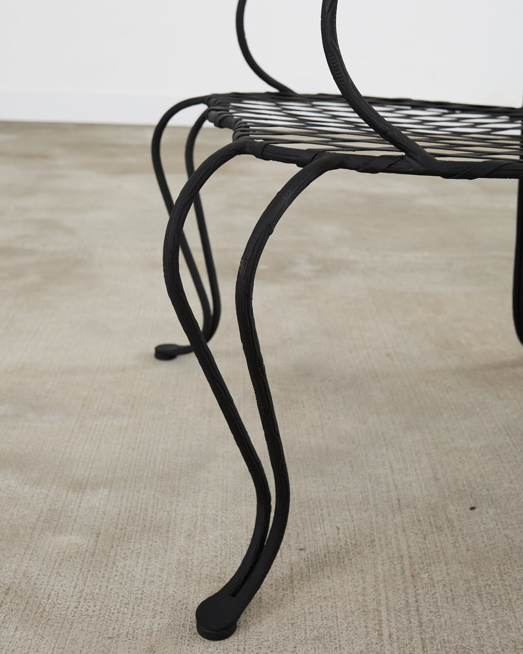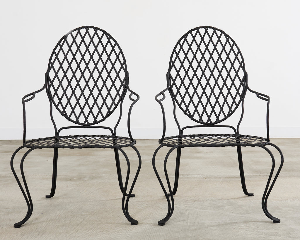 Gorgeous set of four iron patio and garden dining armchairs attributed to Rose Tarlow Melrose House Los Angeles, CA. The set features a large faux bois twig motif iron frame with geometric lattice inset. The seat measures 17 inches high without a seat cushion. Excellent joinery and craftsmanship with an iconic profile. The generous shaped seat is supported by whimsical cabriole style legs in front. Very heavy and sturdy constructed on a large scale. The chairs have been re-painted with a dramatic matte black finish. Sold as a set of four. From an estate in Beverly Hills, CA. The chairs are in our warehouse ready for delivery and installation. New cushions.