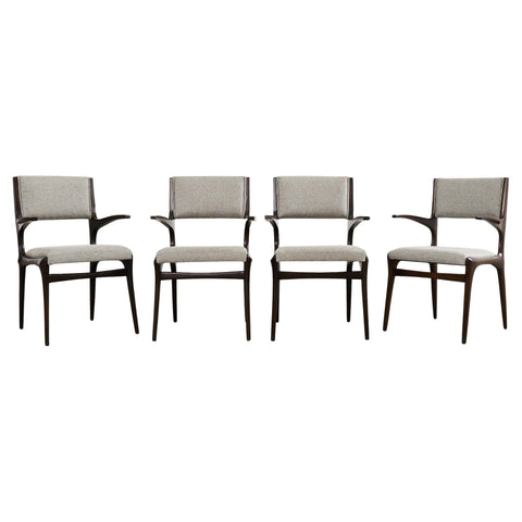 Amazing set of six hand-carved faux rope Spanish dining chairs made in the Napoleon III taste. The set consists of four side chairs and two host armchairs measuring 23.5 inches wide at the arm and 26 inches deep. The frames feature rope detail with knots in the arms and lower legs. The wood has a cerused style finish with a lighter contrasting color in the carved grooves of the rope. Newly upholstered in a natural off-white color. The frames are stamped made in Spain on the insides. Unique and rare with a lovely profile and finish. From an estate in San Francisco, CA.